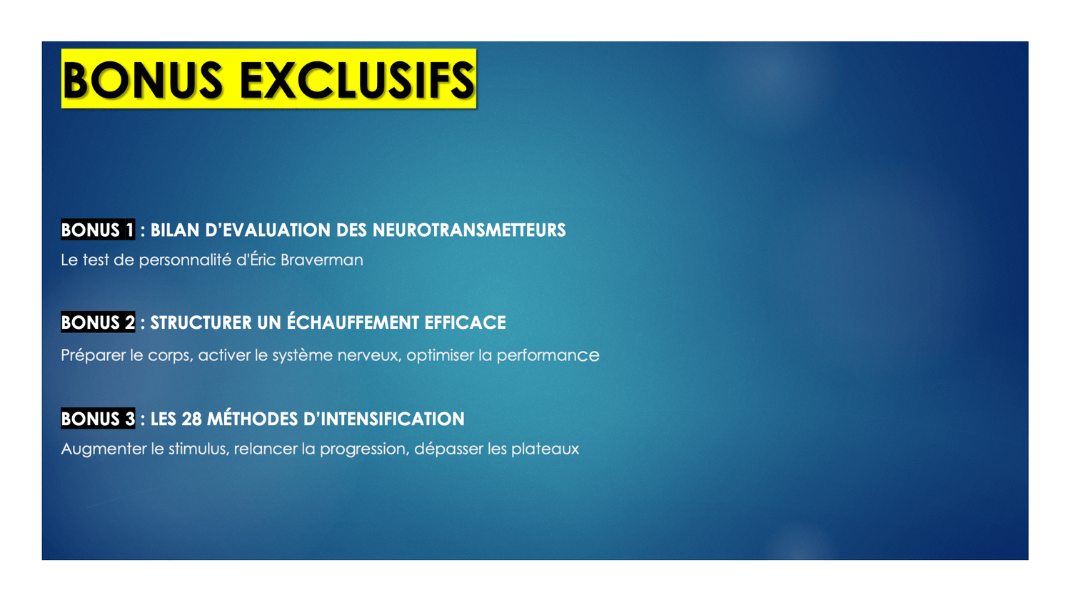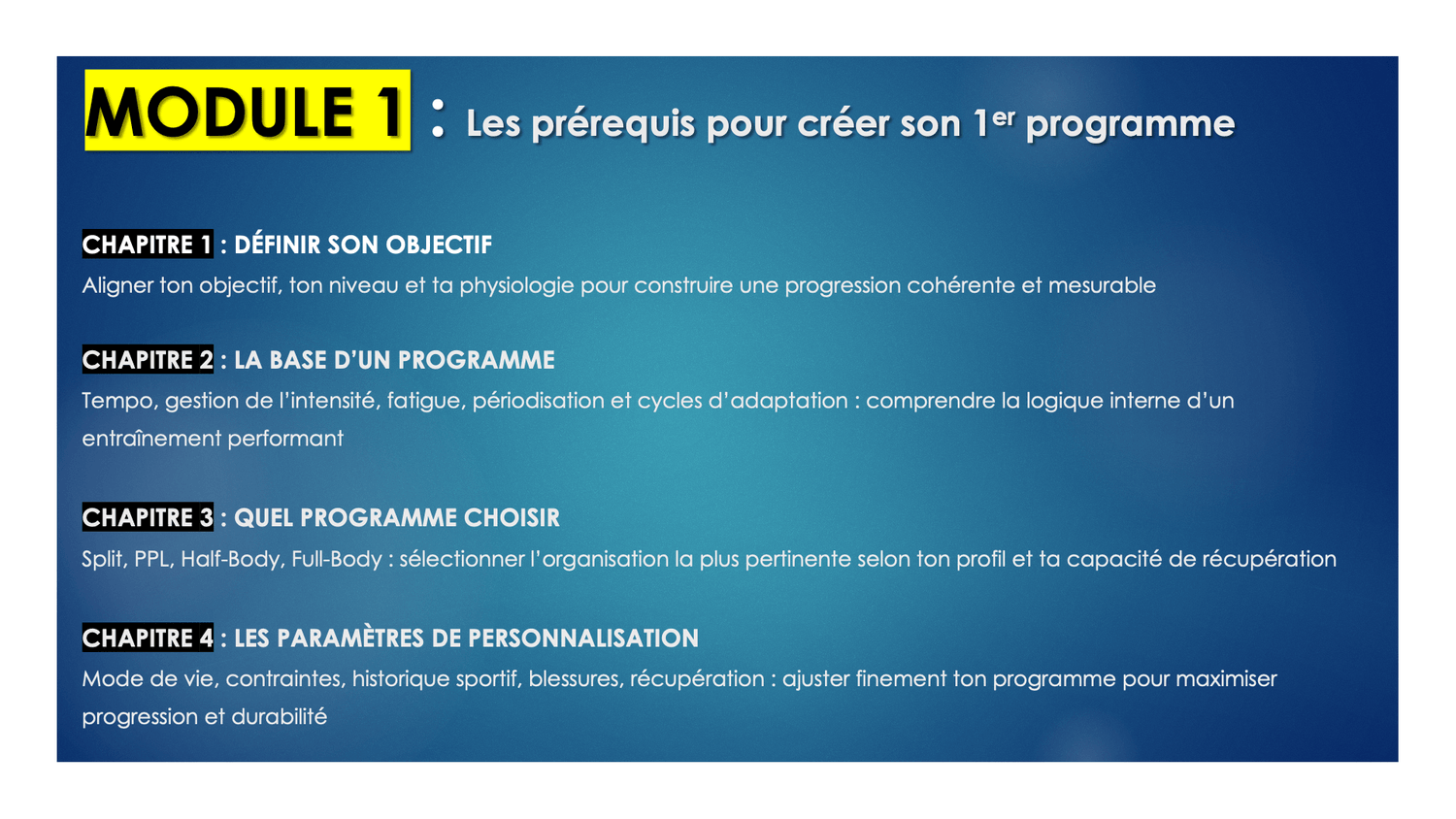 La formation ne peut pas fournir de programme déjà fait car il doit être personnalisé à toi. L'encyclopédie te guide étape par étape pour construire ton programme et le faire évoluer à l'infini.